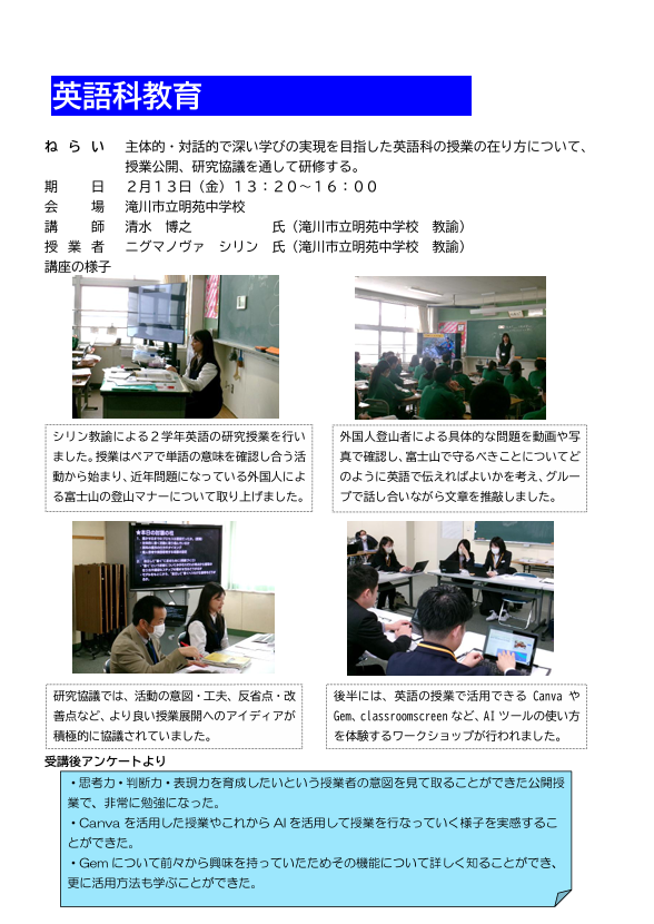 空知教育センター研修講座「英語科教育 授業公開講座」が終了しました。